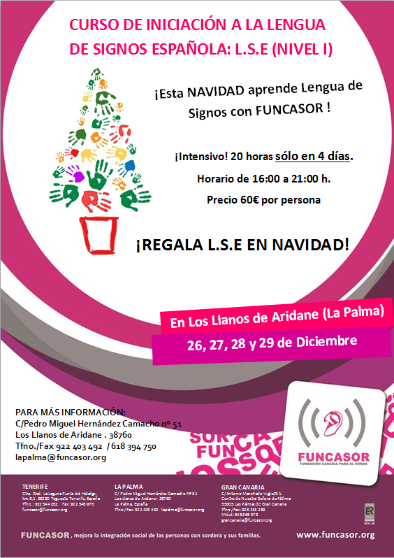Del 26 al 29 de diciembre de 2016. Los Llanos de Aridane. Funcasor organiza un curso intensivo de Lengua de Signos Española estas Navidades. Un curso de 20 horas en solo cuatro días. Horario: De 1...