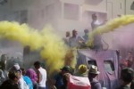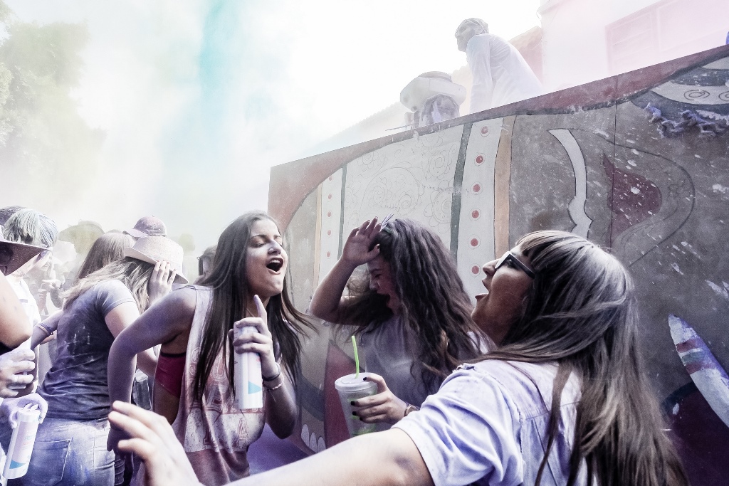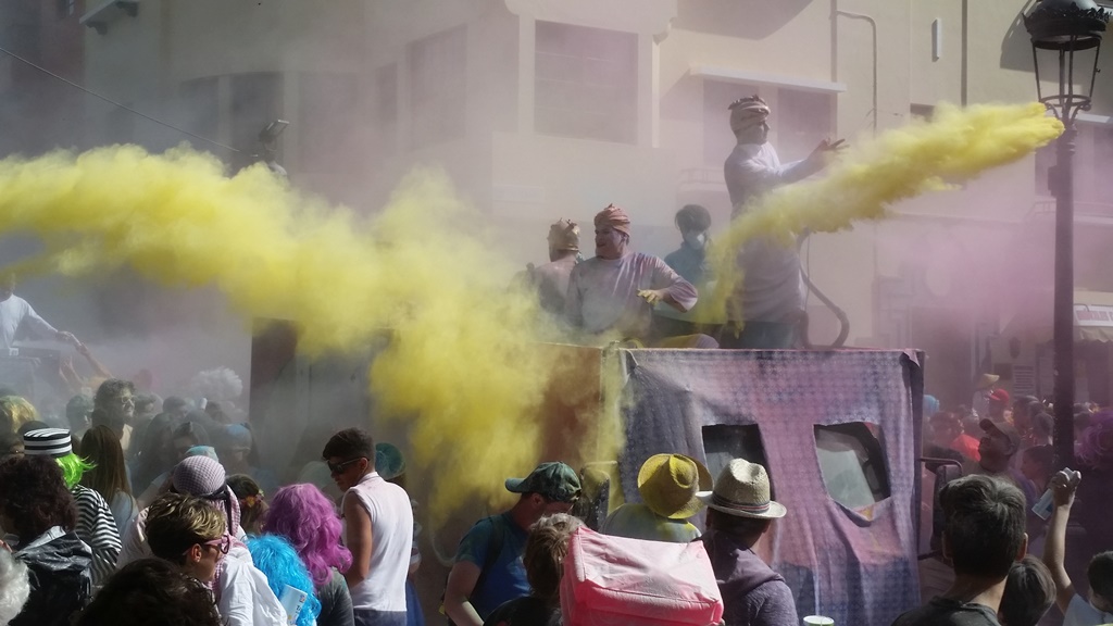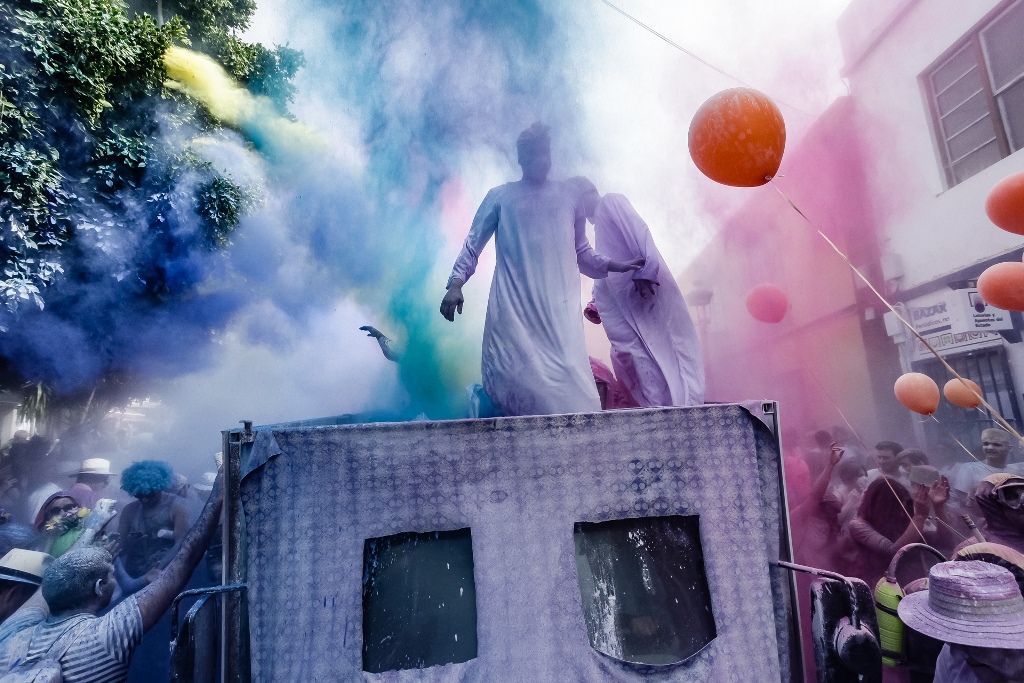 Por unos minutos Holi conquistó este mediodía, pasadas las 14:00 horas, el reino aridanense en una explosión multicolor que transformó las fantasías, tiñó los rostros y despertó las sonrisas de los carnavaleros en pleno casco urbano, donde el blanco inmaculado de los polvos de talco, cuya nube se divisaba a cientos de metros de distancia dio paso a la lluvia de colores que provocó un estallido de júbilo entre los residentes y visitantes que bailaban entusiasmados al ritmo de las batucadas.