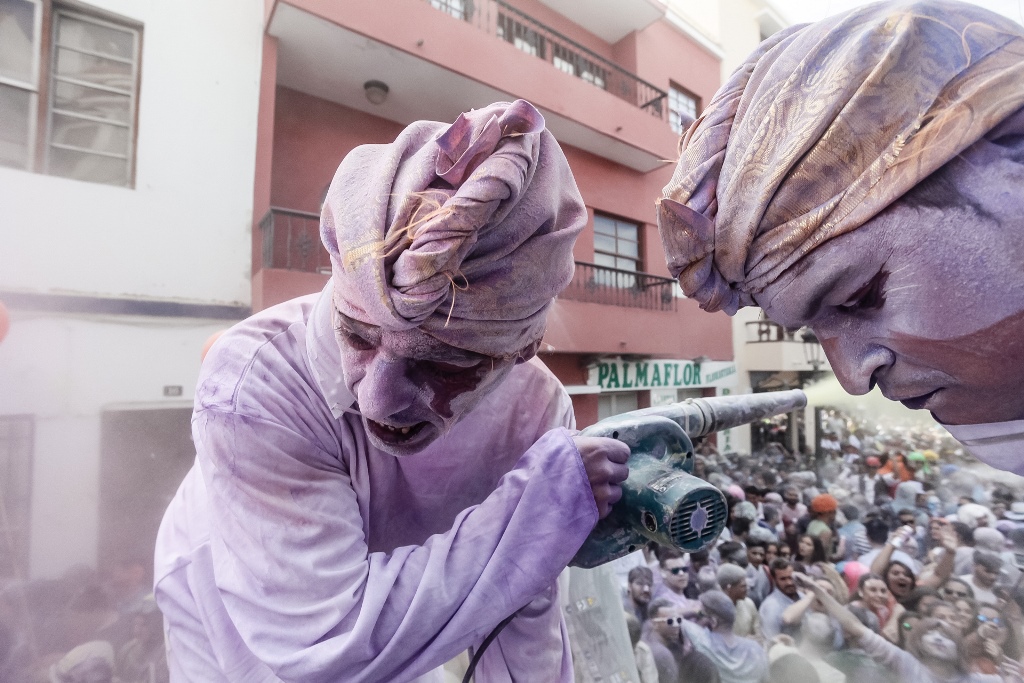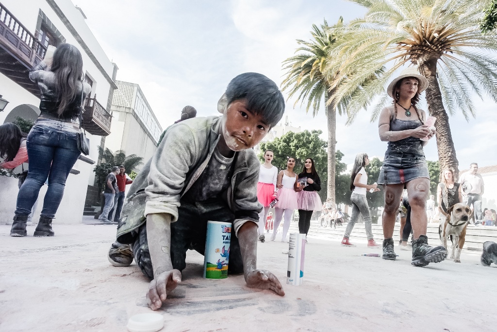 A escasos metros del Ayuntamiento la comitiva se detuvo y se hizo el silencio que marcaba la antesala de uno de los momentos más esperados. Y el sueño se hizo realidad. Tal y como había anunciado la concejalía de Fiestas del Ayuntamiento de Los Llanos de Aridane la tradicional Polvacera se reinventó, incorporando al tradicional blanco de los polvos de talco, los rojos, rosas, naranjas, verdes, azules, violetas y amarillos que dejaron a su paso un divertido rastro que, a posteriori, recogían los más pequeños entre sus manos para escenificar su particular batalla de colores.