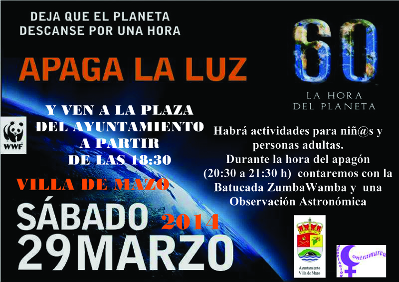 Sábado 29 de marzo de 2014. A partir de las 18:30 horas enVilla de Mazo. Este sábado 29 de marzo se celebra La hora del planeta, un evento que se celebra a nivel mundial impulsado por World Wide Fu...