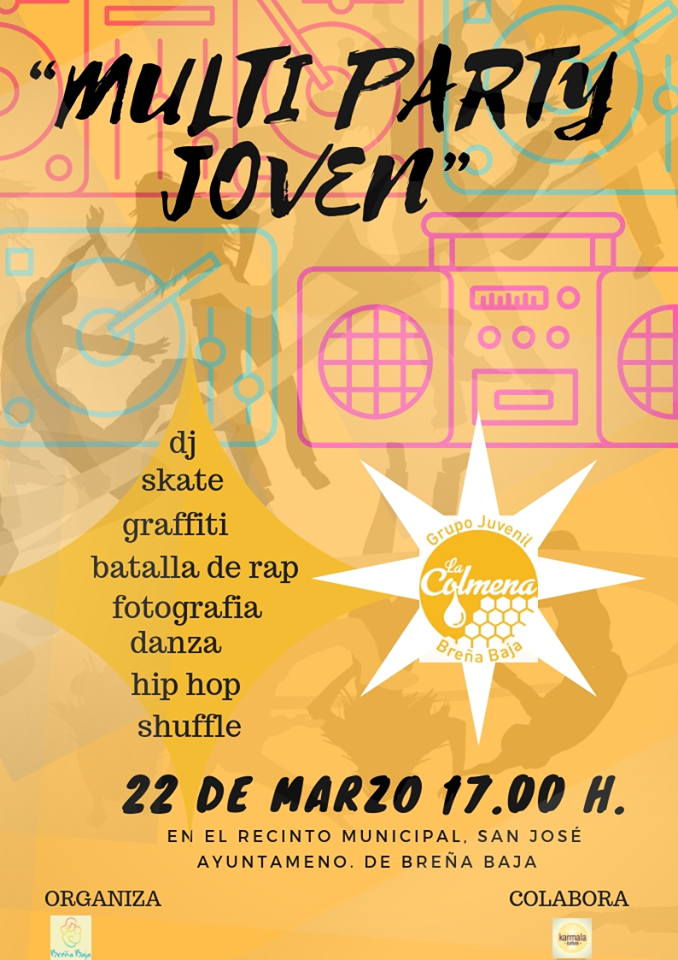 Viernes 22 de marzo de 2019. A partir de las 17:00 horas. Recinto municipal de San José. «Multi Party Joven» constará de múltiples actividades para jóvenes, como Dj; Skate; Graffiti; batallas...