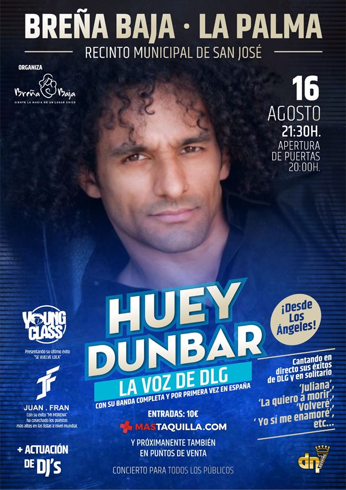 Viernes 16 de agosto de 2019. A las 21:30 horas. Recinto Municipal de San José. Breña Baja. Entradas 10 €. A la venta online >> El Ayuntamiento de Breña Baja presenta a Huey Dunbar y su ba...