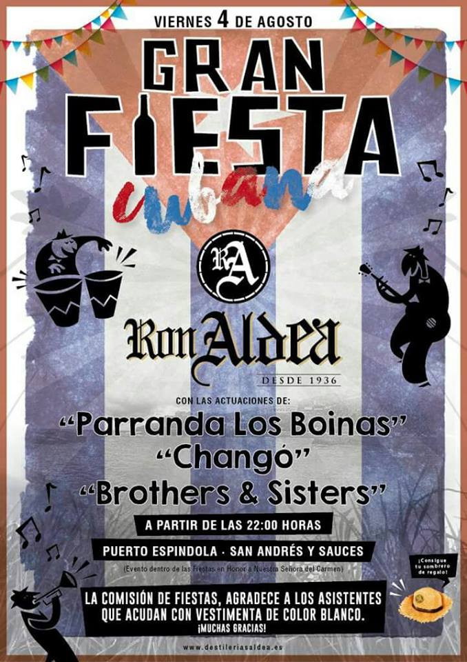Viernes 4 de agosto de 2017. A las 20:00 horas. Puerto Espíndola. San Andrés y Sauces. Gran Fiesta Cubana Ron Aldea , con las actuaciones de «Los Boinas, Chango y Brothers&Sisters», en Puert...