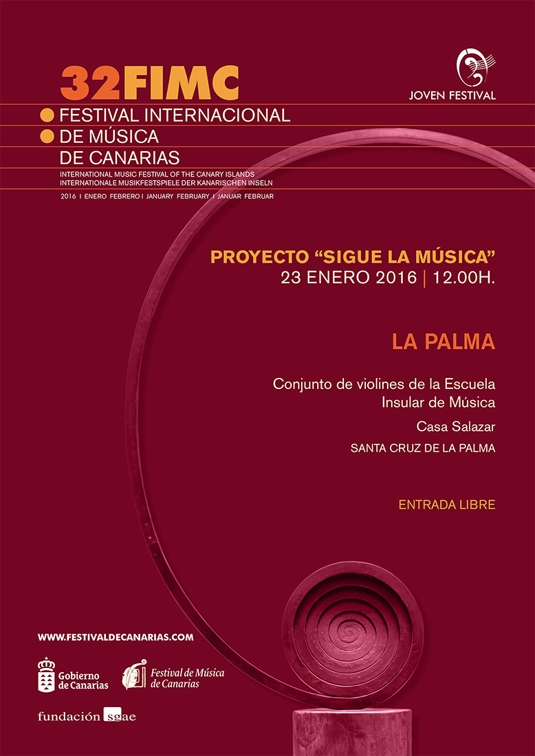Sábado 23 de enero de 2016. A las 12:00 horas. Casa Principal de Salazar. Santa Cruz de La Palma. Entrada libre. El Conjunto de Violines de la Escuela formará parte de la programación del FIMC e...